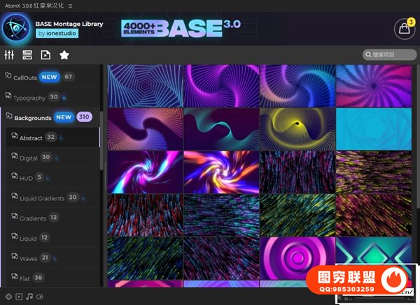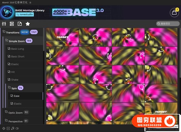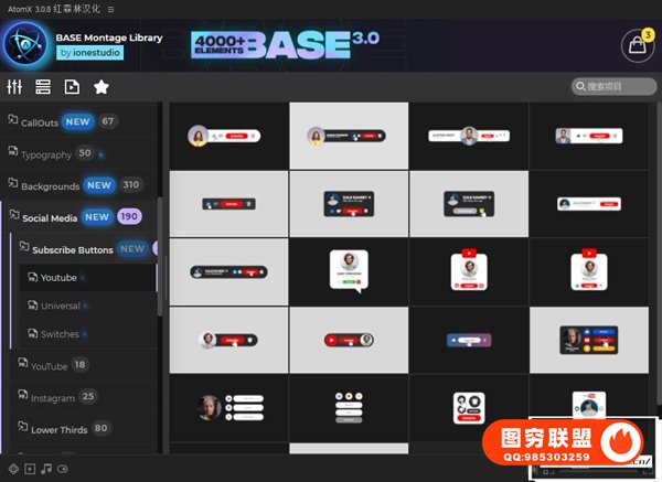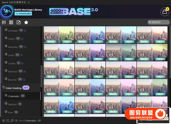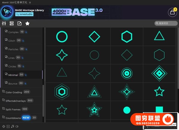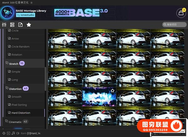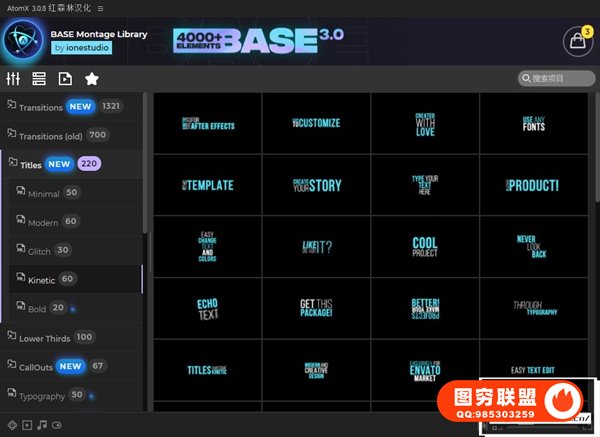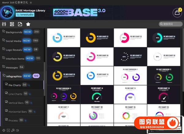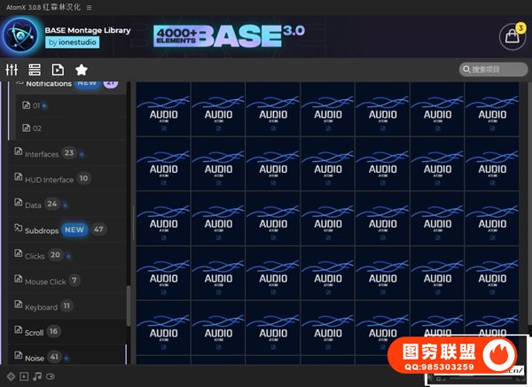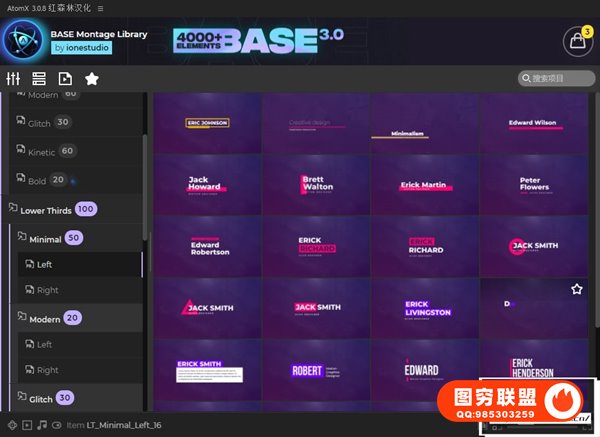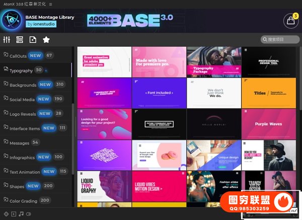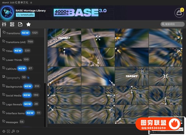 BASE v3.0包含视频编辑所需的所有元素。过渡、标题、下三分之一、标注、版式场景、背景、信息图表、界面项目、消息、文本动画、社交媒体项目、徽标显示、动画图标、形状元素、倒计时、颜色分级预设、分割帧、效果和叠加以及超过 550 种音效。它们被分为19 个类别(简单和光学变焦、透视、毛刺、平移、鱼眼、镜头、拉伸、扭曲、倾斜、旋转、3D 翻转、优雅、形状、分割、画笔、墨水、模糊和淡入淡出)根据顺序自动调整大小,适用于任何 FPS(最高 60)。所有元素使用AtomX 汉化版脚本调用,使用简单直观方便。
