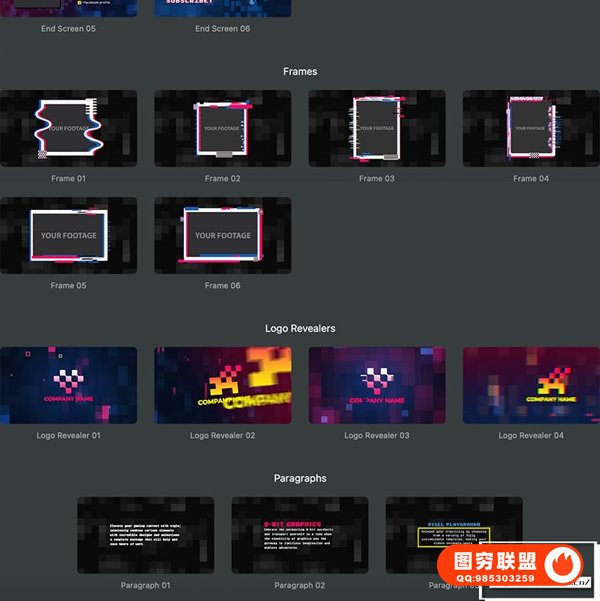 Pixel Playground 模拟了各种像素化效果模板,包括字幕条、文字标题、背景、结束画面、边框、标志揭示、段落等,非常适合制作老式街机游戏,影视动画,广告或其他宣传动画等。您可以自定义文本内容、颜色、调整位置、大小。包含视频教程。