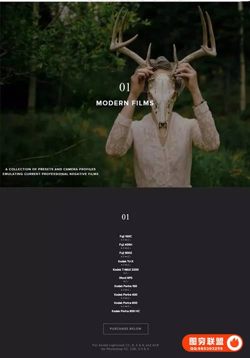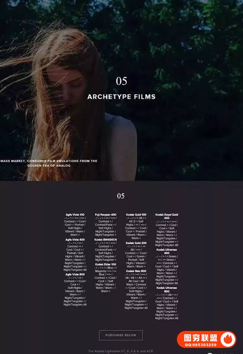 这套预设分别命名为FILM 00, FILM 01,FILM 02,FILM 03,FILM 04,FILM 05,FILM 06和FILM 07;每套都各有侧重地收录了不同类型的胶片型号。