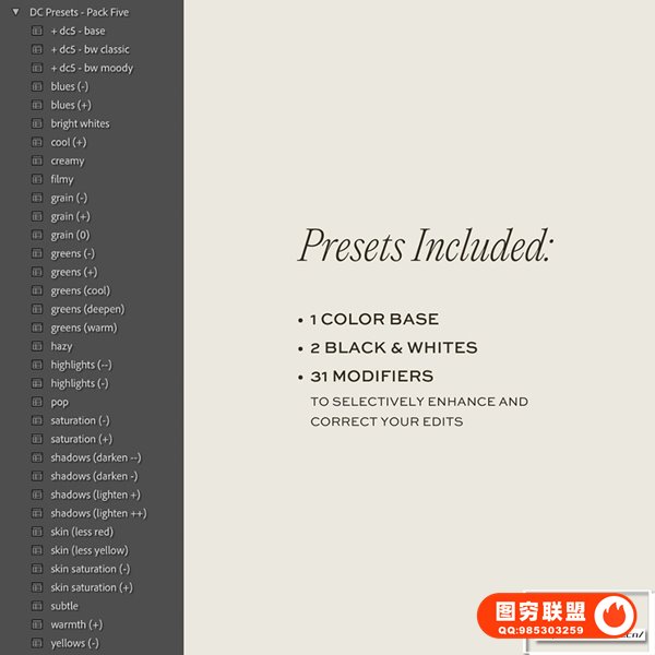 所有 DC 桌面预设包均包括 1 个基色预设、2 个黑白预设、31 个修饰预设,可选择性地增强和纠正您的编辑(例如“流行”、“微妙”、“胶片”、“朦胧”、“奶油色”、多种皮肤)校正器、绿色校正器等)、迷你编辑课程、针对每个包的“与我一起编辑”视频,以及包含下载和安装说明、编辑技巧等的 PDF 指南。这些预设与 Lightroom 和 Adobe Camera Raw 兼容。