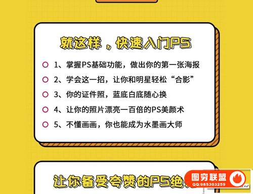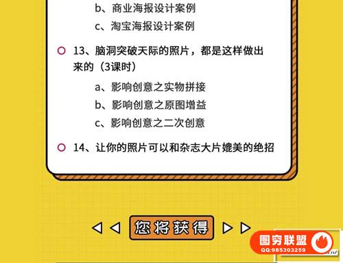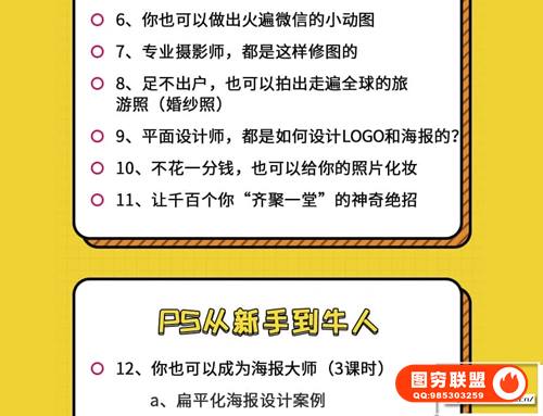 对于普通人而言,PS更是让你少了一个求人的理由,高效工作的同时还收到崇拜的目光,简直不要太赚了:客户要出概念图,别人和设计师沟通个大半天,你直接打开PS几分钟就搞定,不仅省了时间,还做得有模有样;大合照没拍好,别人还在用美图秀秀戳戳戳,你打开PS进行精修,效果媲美影楼大片,领导立马笑开颜,还能俘虏妹子的欢心;还有老板临时让你做个商业海报、邀请卡、banner这类看似超难的作品,只要有了PS,自己也能轻松做出来;这套来自doyoudo的零基础学photoshop,18节课从小白到大神视频课,3.77G