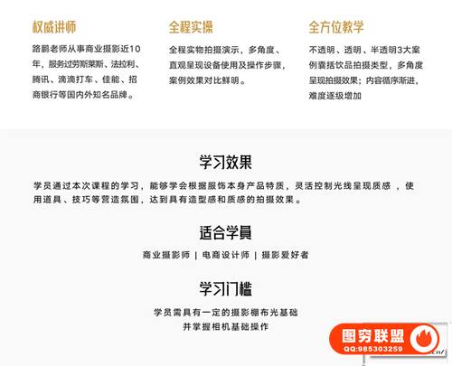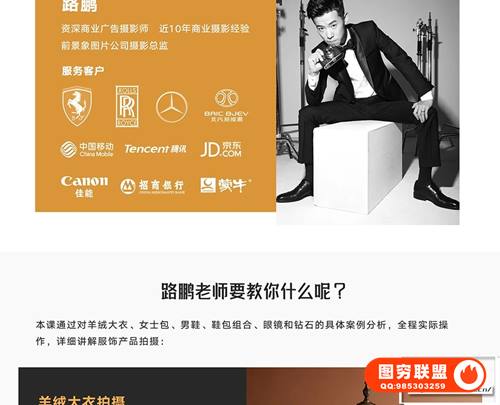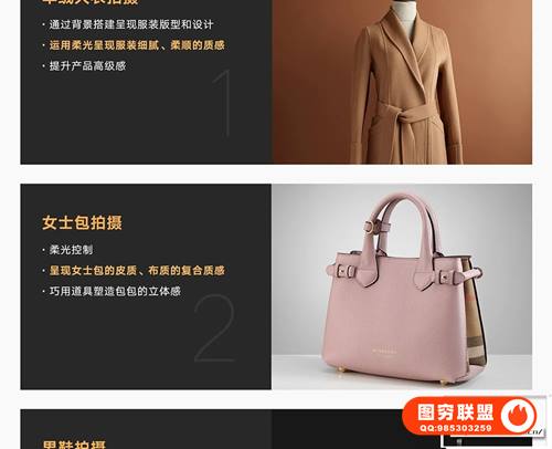 干呼万唤始出来,继《产品摄影之饮品拍摄》后,知名商业摄影师将为你带来服饰拍摄课程,包括[羊绒大衣、女式包、男鞋、鞋包组合、眼镜和钻石6个案例]: