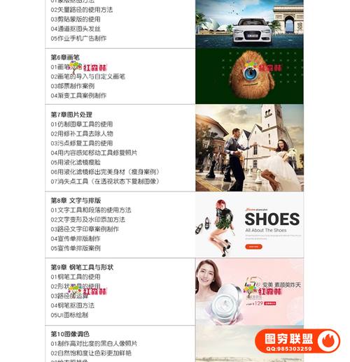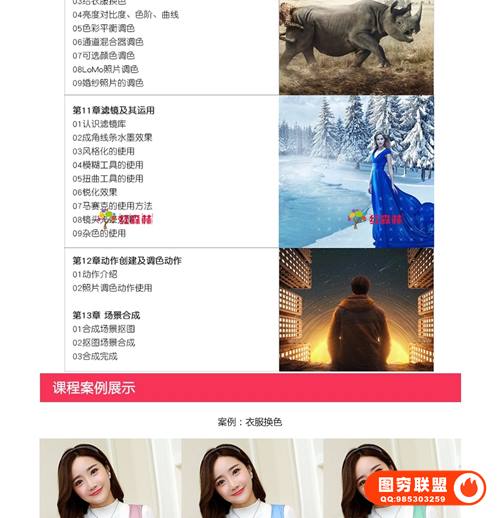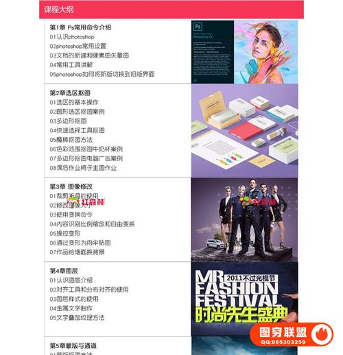 除了有理论知识、工具、抠图、合成、调色、图层 样式、通道蒙版、滤镜等技法原理的讲解之外,还有一些设计领域实战案例的讲解。通过对本教程的学习,你将获得掌握产品抠图,快速去水印,头发丝抠图,海报合成 宣传页设计……等更多技能。