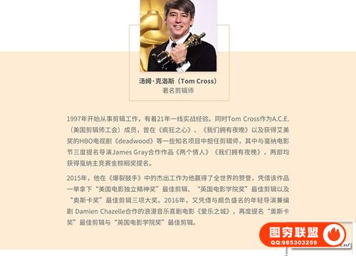 汤姆·克洛斯(Tom Cross),著名剪辑师。1997年开始从事剪辑工作,有着21年一线实战经验。A.C.E.(美国剪辑师工会)成员,曾在《疯狂之心》、《我们拥有夜晚》以及获得艾美奖的HBO电视剧《deadwood》等一些知名项目中担任剪辑师,其中《两个情人》《我们拥有夜晚》,两部均获得戛纳主竞赛金棕榈奖提名。《爆裂鼓手》更是一举拿下“美国电影独立精神奖”最佳剪辑、“英国电影学院奖”最佳剪辑以及“奥斯卡奖”最佳剪辑三项大奖。2016年,他又凭借《爱乐之城》,再度提名“奥斯卡奖”最佳剪辑与“英国电影学院奖”最佳剪辑。课时共50节,文件大小:12.8G