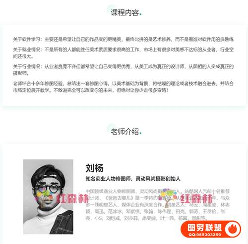 课程以美术及摄影作为背景,通过技术技巧与案例操作融合,为大家揭开明星大片、广告大片及时尚杂志封面背后的秘密,针对一些摄影爱好者或是有一定修图基础的同学来说,是一个进阶学习的机会。这套视频将让你对商业后期有一个全新的认识,甚至还能通过此次学习来换取更多的收益。