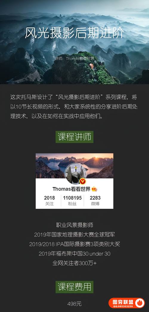 课程讲师作为2019年国家地理摄影大赛全球大奖得主,以及图虫、微博、知乎等平台最热门的风景摄影师之一,专业技术过硬。