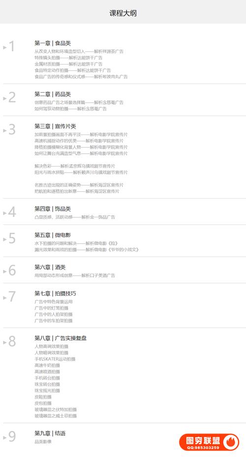课程内容含 32 支广告案例解析,12支广告实操复盘, 品类涉及汽车、数码、食品、医药、酒类、珠宝、箱包等,以及城市宣传片、微电影。课程剖析多样特种拍摄技法,如高速摄影、逐格拍摄、人拍架、车拍架等,以及不同产品打光艺术。