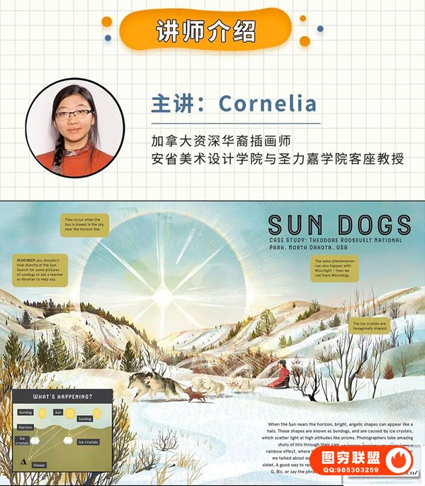 目前,市面上关于童书、绘本创作的课程非常多,但能把全年龄段出版物插画讲明白的老师寥寥无几。 Cornelia老师是其中一个,她可以说是出版刊物类插画天花板级别的插画艺术家。Cornelia老师是加拿大资深华裔插画师,拥有非常全面的创作能力,作品涉及报刊插画、儿童读物、动画分镜、广告设计等多种领域,在国际插画艺术圈有着较大的影响力。