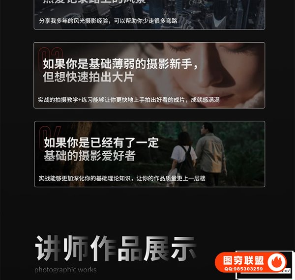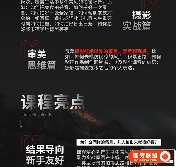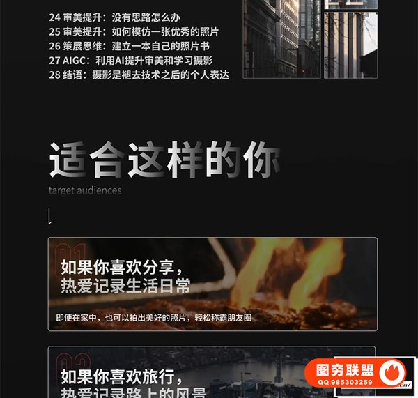熊熊Bearie摄影创作实战课:人像/风光/旅行/静物/生活纪实:新手友好,实用性强,五大模块(生活、人像写真、旅行风光、基础、审美思维)教你轻松拍出生活的氛围感。非常适合热爱记录生活,分享家庭日常的普通摄影爱好者,热爱旅行记录旅途风景的博主或向进一步提升的专业摄影师等广泛人群。课程共29节(目前仅21节无素材)