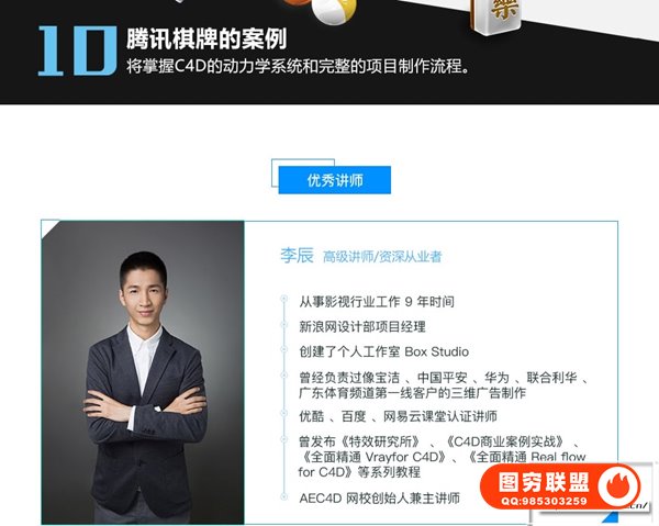 关于老师:李辰从事影视行业工作9年时间,新浪网设计部项目经理, AEC4D网校创始人兼主讲师,创建了个人工作室Box Studio。曾经负责过像宝洁、中国平安、华为、联合利华、广东体育频道等一线客户的三维广告制作,优酷、百度、网易云课堂认证讲师,曾发布《特效研究所》、《C4D商业案例实战》、《全面精通Vray for C4D》、《全面精通Realflow for C4D》等系列教程。