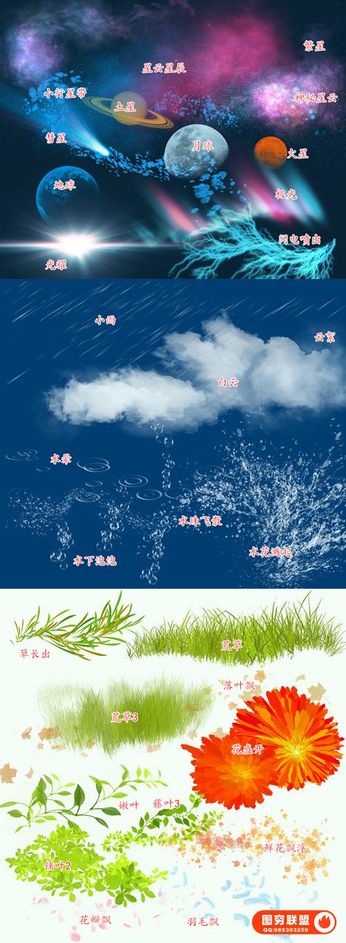 6、自然:新增宇宙星空、星云、星球系列,极光、光谱、光耀、闪电、触电、火、火焰描绘、爆炸、颗粒、云、雨、水、草、叶、花、羽毛、蝴蝶、鱼群、鸟群等。