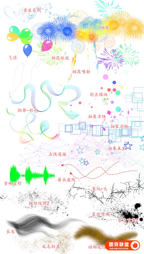 7、设计:新增和改进气球、烟火、火花、飘带、点线连接、英文背景、音频波形、铁链、绳子、箭头线、墨迹喷溅、斑驳肌理、毛系列等。