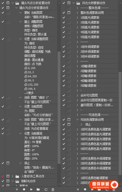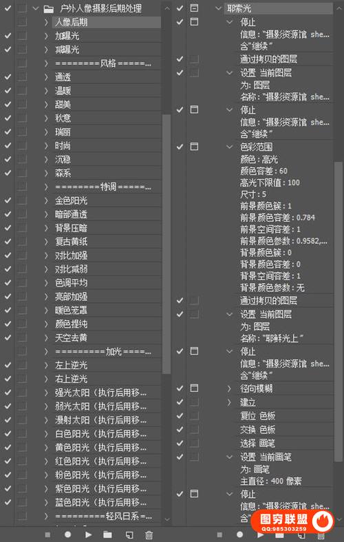 这是一套功能非常强大的系列动作合集,包括质感磨皮到后期调色、美白、光晕冲光、、耶稣光、特效、户外风光、大光圈修饰等。