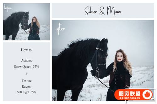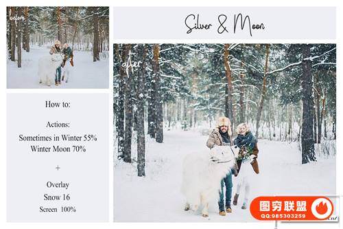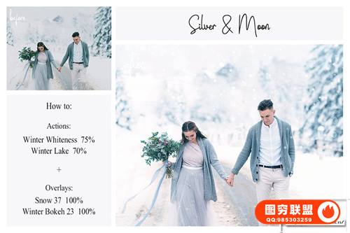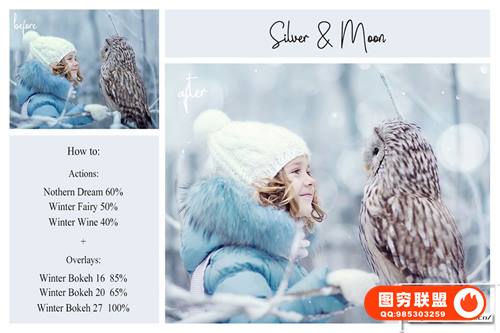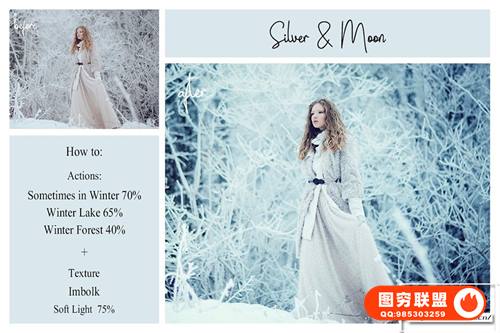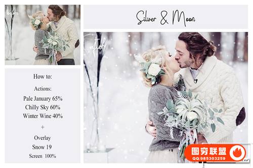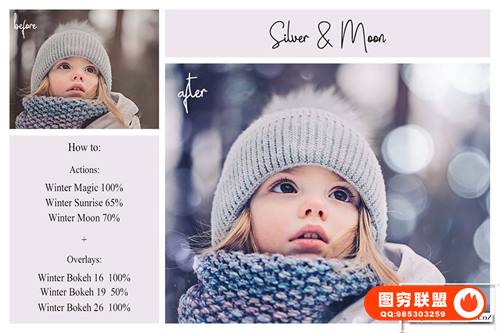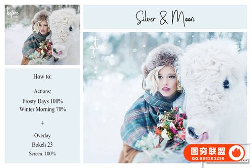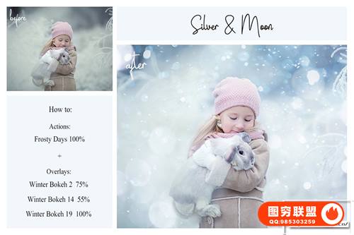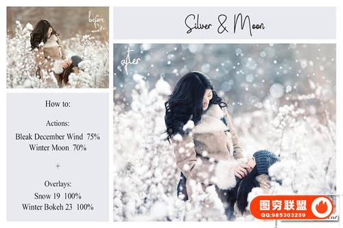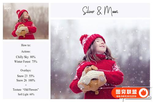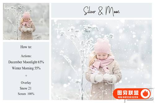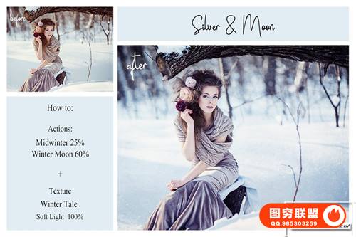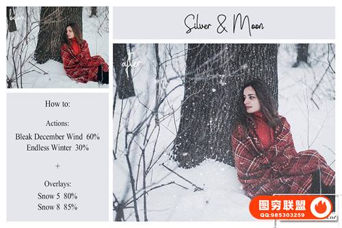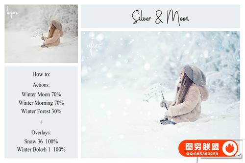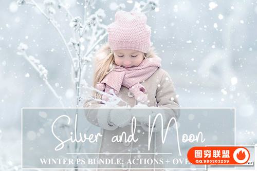 “Silver & Moon”是 57 个 PS 动作、70 多个叠加层和 30 多个精美艺术纹理的集合。凉爽、干净的色彩和美妙的效果 – 您需要在一组照片中为您的照片添加大量冬季魔法。