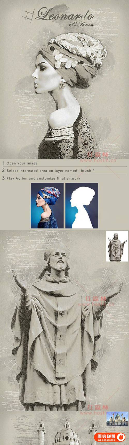 [PS动作]幅莱昂纳多·达芬奇绘画PS动作复古素描艺术效果 Leonardo Photoshop Action