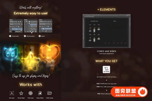 支持的Photoshop版本: CS3 – 2021 。所有的PS版本。多功能Photoshop Action可将您的文本,矢量形状,像素图层,智能对象,图层组转换为炫酷的彩色灯泡。