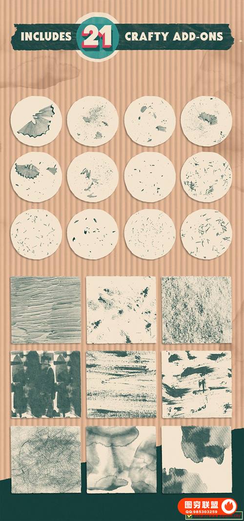 我们还提供了36张撕纸,包括21种巧妙的附件(包括墨水纹理和铅笔屑),可帮助您立即构建自己的构图,让您的创作无限的可能性!