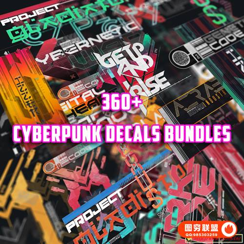 [图片素材]360组赛博朋克未来派数码科技风格文字图形贴花贴纸PNG元素包 360+ Cyberpunk Decals Bundle