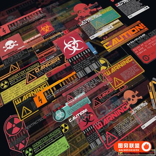 赛博朋克、危险标志、编号和序列贴纸