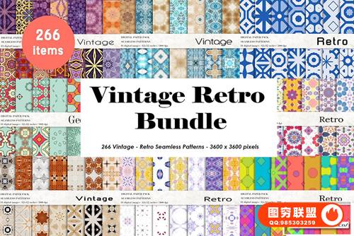 [图片素材]266个复古无缝图案拼贴元素背景素材 Vintage Retro Patterns Bundle