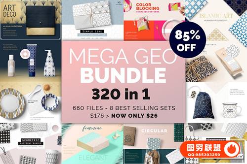 [矢量素材]320款优雅艺术装饰几何线条印花无缝图案矢量素材 Mega Geometric Patterns Bundle