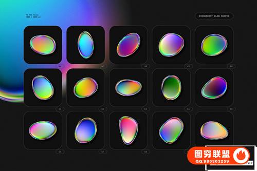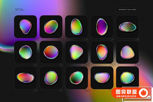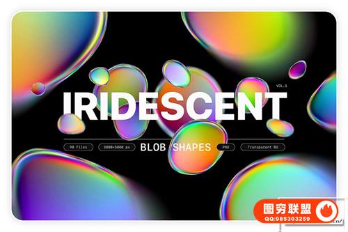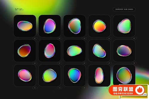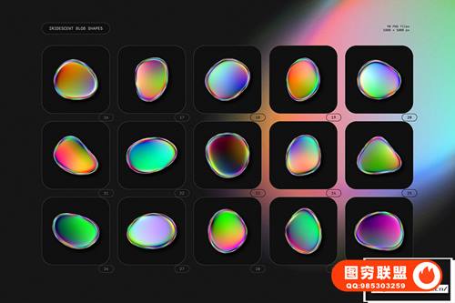 [图片素材]90款彩虹渐变色金属镭射气泡水珠PNG图片素材 Iridescent Blob Shapes Collection