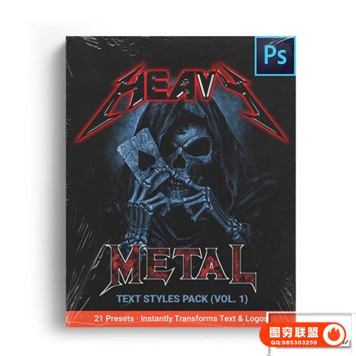 共有 21 种样式和变体,可立即将您的纯文本转换为 80 年代风格的重金属图形。只需将下载的文件导入到 Photoshop 里即可使用。