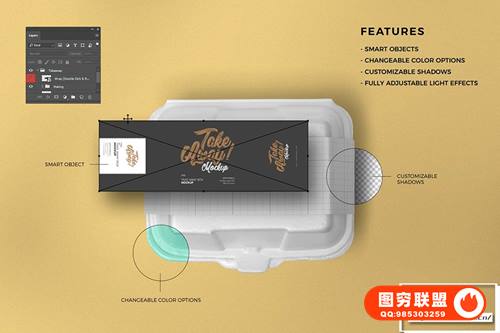 6 个一次性食品包装模型:该食品包装模型集将帮助您在一次性盒子的 8 x 4 英寸包装套上展示您的包装或品牌设计。这些食品盒模型提供了一些智能层,允许您个性化泡沫盒的颜色、阴影、效果和模型的背景。
