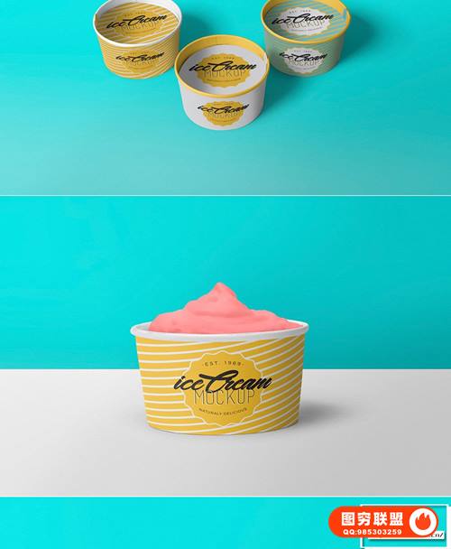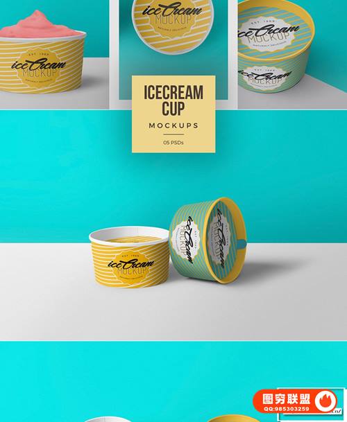 5 个美味的冰淇淋杯模型:这些冰淇淋杯模型提供 5 种不同的布置,具有独特的风格和姿势,以吸引人的方式展示您的冰淇淋品牌。您可以使用智能对象功能更改冰淇淋杯及其盖子的设计。您还可以使用其智能图层调整冰淇淋模型的颜色、阴影、效果和背景。