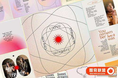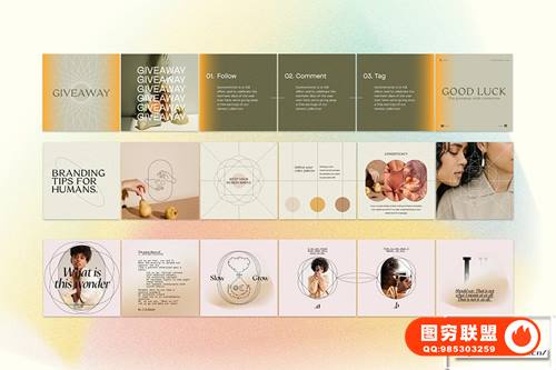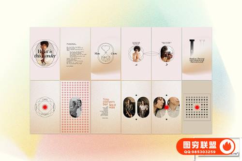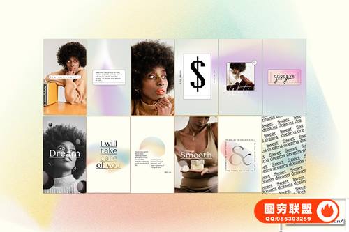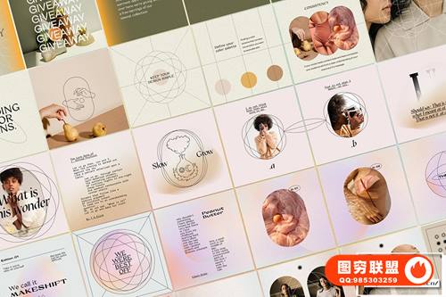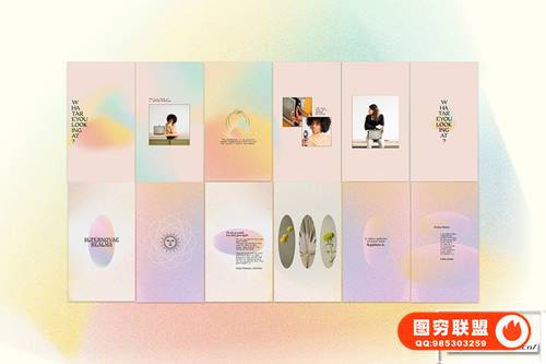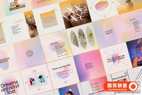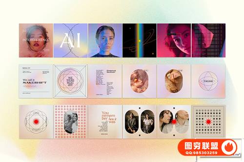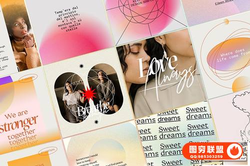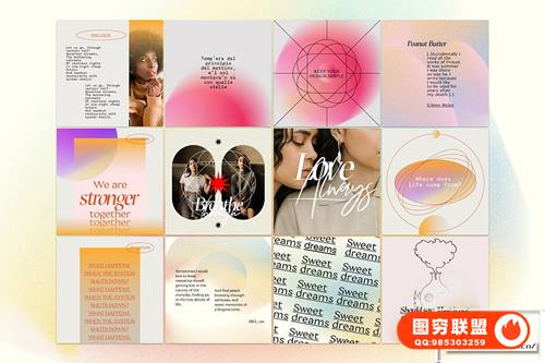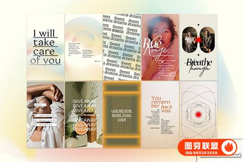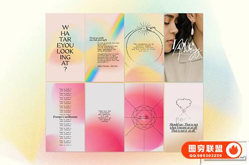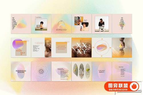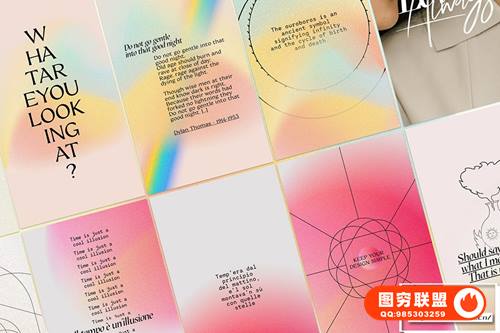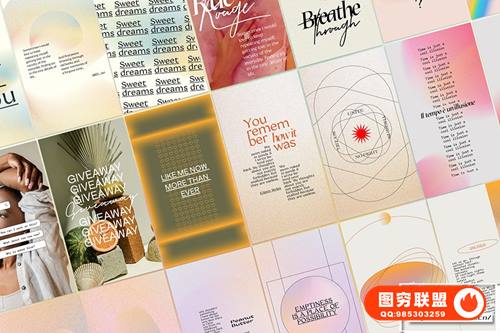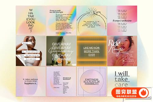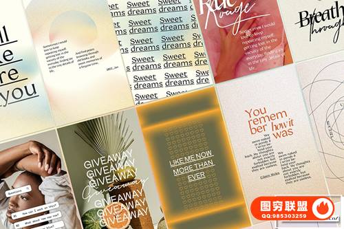 该系列包含 90 个帖子,组合成 15个carousels + 26 个Quotes,版式为 Ins故事和帖子,展示了酷炫的渐变和古怪的字体美学。