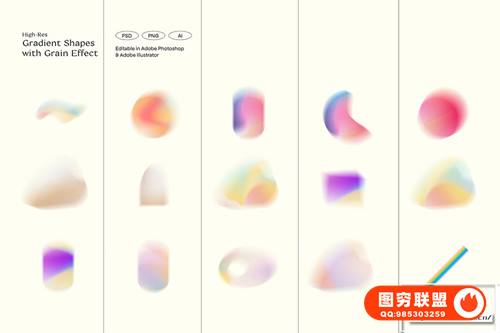 带有颗粒效果的现成 PNG 渐变形状可用作背景,或创建新的布局和选项。