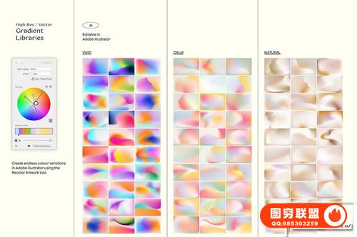 一个庞大的 .ai(Adobe Illustrator)库,包含完全可定制的网格渐变,包括 90 种颜色变化