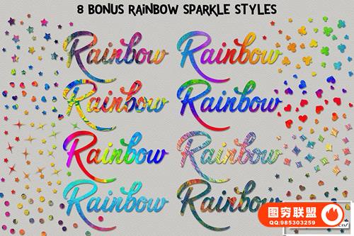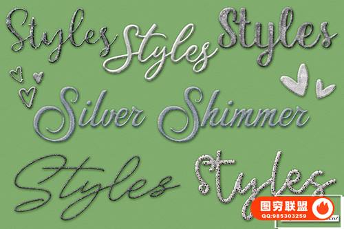 在这组中有 30 种 Silver Bling 图层样式、10 种 Silver Shimmer 图层样式和 7 种额外的 Rainbow Sparkle 图层样式。