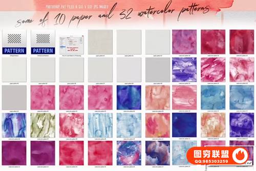 包含内容:32P 水彩JPG 512*512,2*PAT(PS图案文件)。