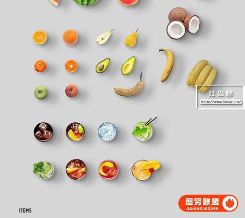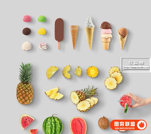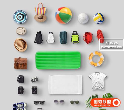 100 多个对象(PNG)如夏季水果,饮料,遮阳伞,沙滩排球,相机,背包,T恤,短裤,拖鞋,冰块,海螺贝壳,泳圈,墨镜,冰激凌,遮阳帽等等。