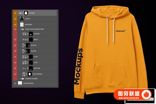 如何工作:打开模型文件,选择 PLACE YOUR DESIGN HERE 图层组,选择智能对象并单击两次。将您的设计拖到打开的文档中。保存并关闭。看看结果!对其余的智能层重复该操作。您可以更改 LIGHTS 和 SHADOWS 图层的不透明度。背景颜色可以更改为您喜欢的任何颜色。如果您希望设计元素与连帽衫具有相同的石南花纹理,请将 SMART LAYERS 图层组移至 HOODIE 图层组。