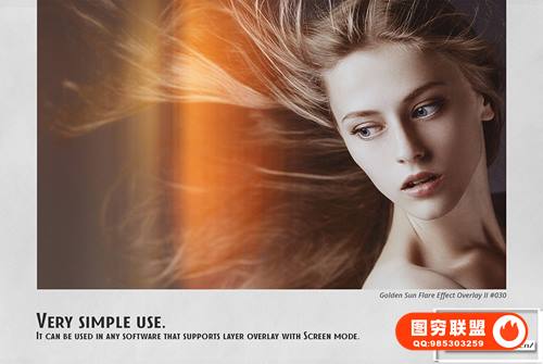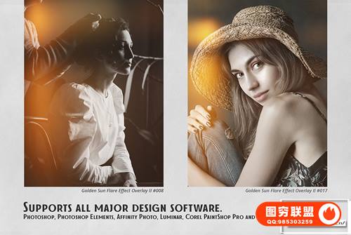 适合业余爱好者和专业人士。彩色和黑白照片效果极佳。为方便起见,添加了用于在屏幕模式中选择和覆盖叠加层的操作。这将适用于 Photoshop 和 Photoshop Elements。Golden Sun Flare 2 叠加可用于任何支持屏幕模式下的图层叠加的图形编辑器。