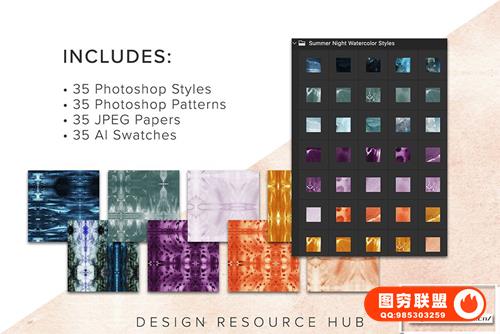 图穷联 » [PS样式]35种夏日夜晚水彩画纹理图案文本样式AI色板设计素材 Summer Ni