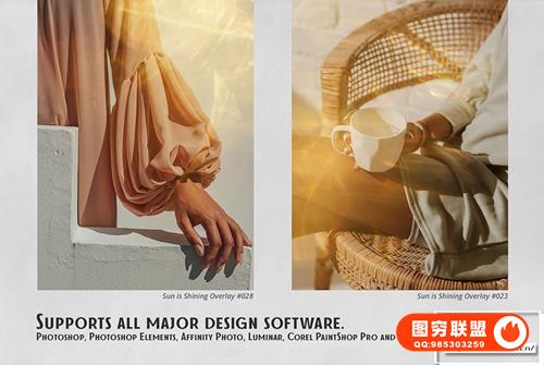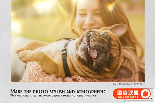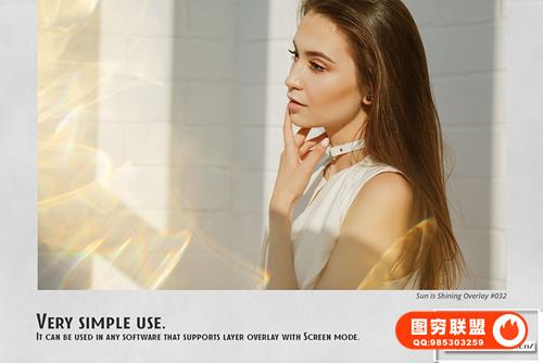 适合业余爱好者和专业人士。在彩色和黑白照片上表现出色。为了您的方便,在屏幕模式中添加了用于选择和覆盖叠加层的操作。这适用于 Photoshop 和 Photoshop Elements。Sun is Shining Overlays 可以在任何图形编辑器中使用,它支持屏幕模式下的图层叠加。