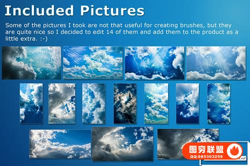 在此产品中,您将找到以下格式的 100 个云彩画笔和 10 个额外画笔: