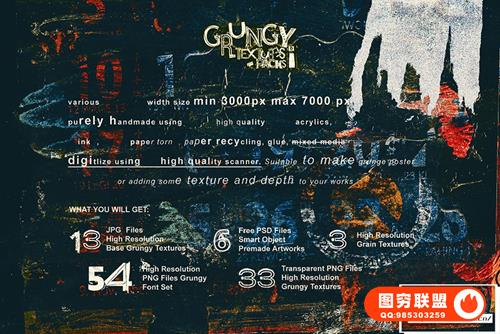 各种宽度尺寸最小 3000 像素最大 7000 像素纯手工制作,使用高品质丙烯酸树脂、墨水、撕纸、纸张回收、胶水、混合媒体使用高品质扫描仪进行数字化。适合制作垃圾海报或为您的作品添加一些纹理和深度。