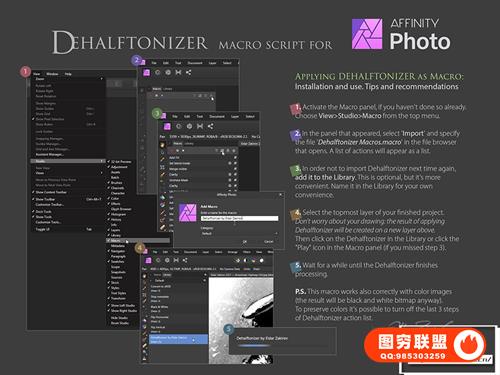 3. 墨水。Eldar Zakirov.afmacros 的 Dehalftonizer。将灰色区域转换为带有 100% 黑色或白色以进行打印的点状半色调的宏操作保存为库宏。这是一个比前一个更方便的选择。