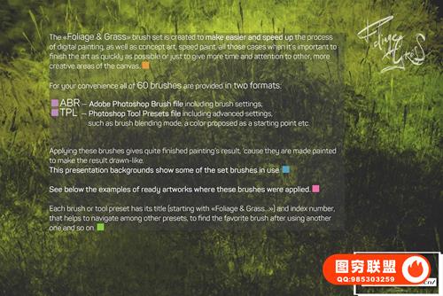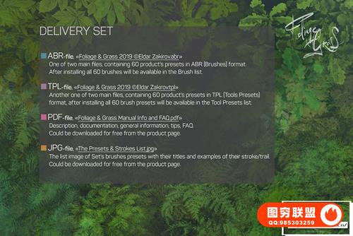 关于产品:Foliage & Grass 是60 种画笔,具有 ABR和TPL格式的Adob e Photoshop、Photoshop Elements、Adobe Fresco设置