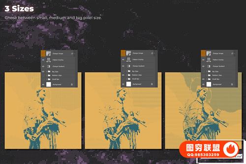 与其他类似产品不同,这不是一个动作包,它是一个带有可编辑和可调整图层的真实 Photoshop 模板。它不只是将您的图像从灰度转换为位图,它还会在智能对象上创建位图效果。您可以自由地尝试颜色、光线、尺寸,以获得您想要的效果并控制整个过程。