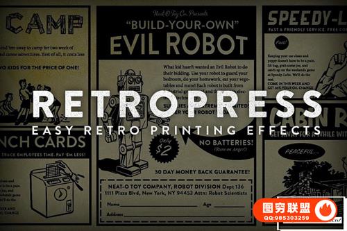RetroPress – 让您的作品快速呈现经典的复古印花。RetroPress 让您的作品看起来像真正的墨水浸入纸中。获得细微的渗色、略微粗糙的墨水边缘、浸入新闻纸的墨水质感和半色调效果。