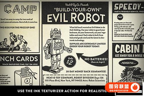 墨水纹理 – 当墨水渗入纸张时,它会流过细小的纸张纤维并在它们之间形成水池。这创造了一种微妙的纹理。使用 Retropress,您可以获得一个易于使用的动作,让您可以根据需要调整强度。