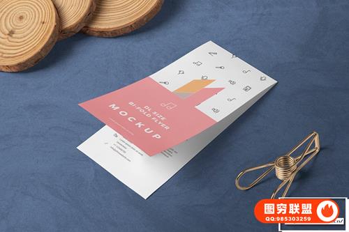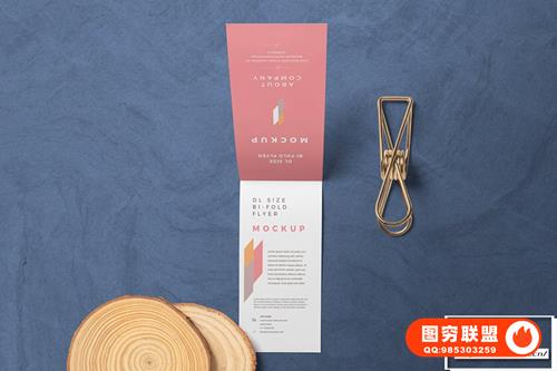 DL 尺寸垂直双折传单样机,带有回形针和木片。