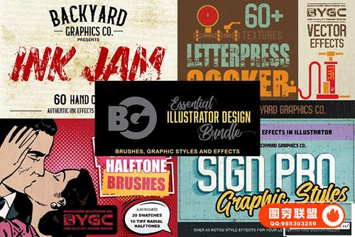 [AI样式]280+半色调粗糙复古划痕湿润破损纸张矢量纹理Illustrator色板笔刷文本样式合集 Essential Illustrator Design Bundle