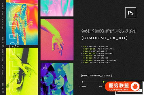 无论您是想制作令人印象深刻的专辑插图、Badass 街头服饰图形还是对图像进行有趣的动态实验,Spectrum 都是希望为他们的工作增加一些态度的中级到高级 Photoshop 用户的绝佳工具。