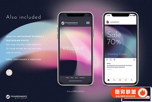 该套装还包括大小适合Instagram 帖子和 Instagram 故事的 JPG 图像,您可以将其直接上传到手机或任何社交媒体应用程序(如Canva),并用作社交媒体营销的背景。